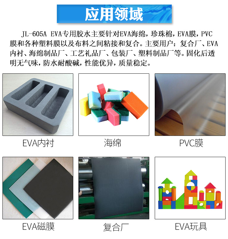 JL-605A复合胶水是专门贴这个珍珠棉的,该产品为单组份颜色淡黄,适合人工涂胶以及复合机滚胶,是专门针对EVA材质专用粘合剂。主要应用于EVA海绵、PVC、ABS、PC、EPE泡沫、金属等材质